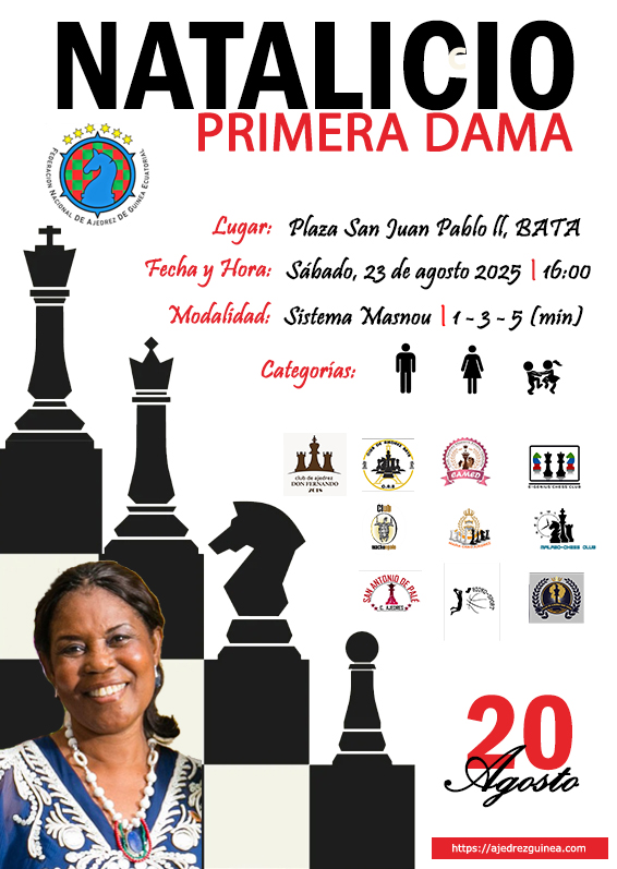 En la tarde del sábado 23 de agosto de 2025, en la Plaza San Juan Pablo II, ubicada en la Ciudad de Bata, por motivo del natalicio de la 1ra Dama, se ha planificado un evento de ajedrez para celebrar este día.