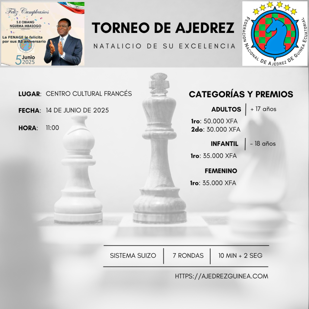 El torneo “Natalicio de SU Excelencia” fue un evento organizado por la Federación Nacional de Ajedrez de Guinea Ecuatorial en conmemoración al 83 aniversario del presidente de la nación “Obiang Nguema”, con participación abierta a jugadores de todas las categorías. El objetivo principal una vez más consistía en fomentar la competitividad de los jugadores y detectar nuevos talentos.